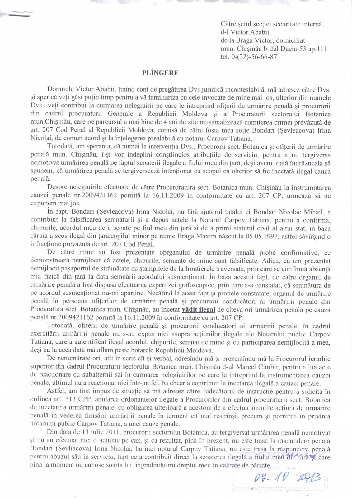 Refuzul Procuraturii de a porni un Dosar Penal împotriva acţiunilor ilegale ale notarului T Carpov [164]