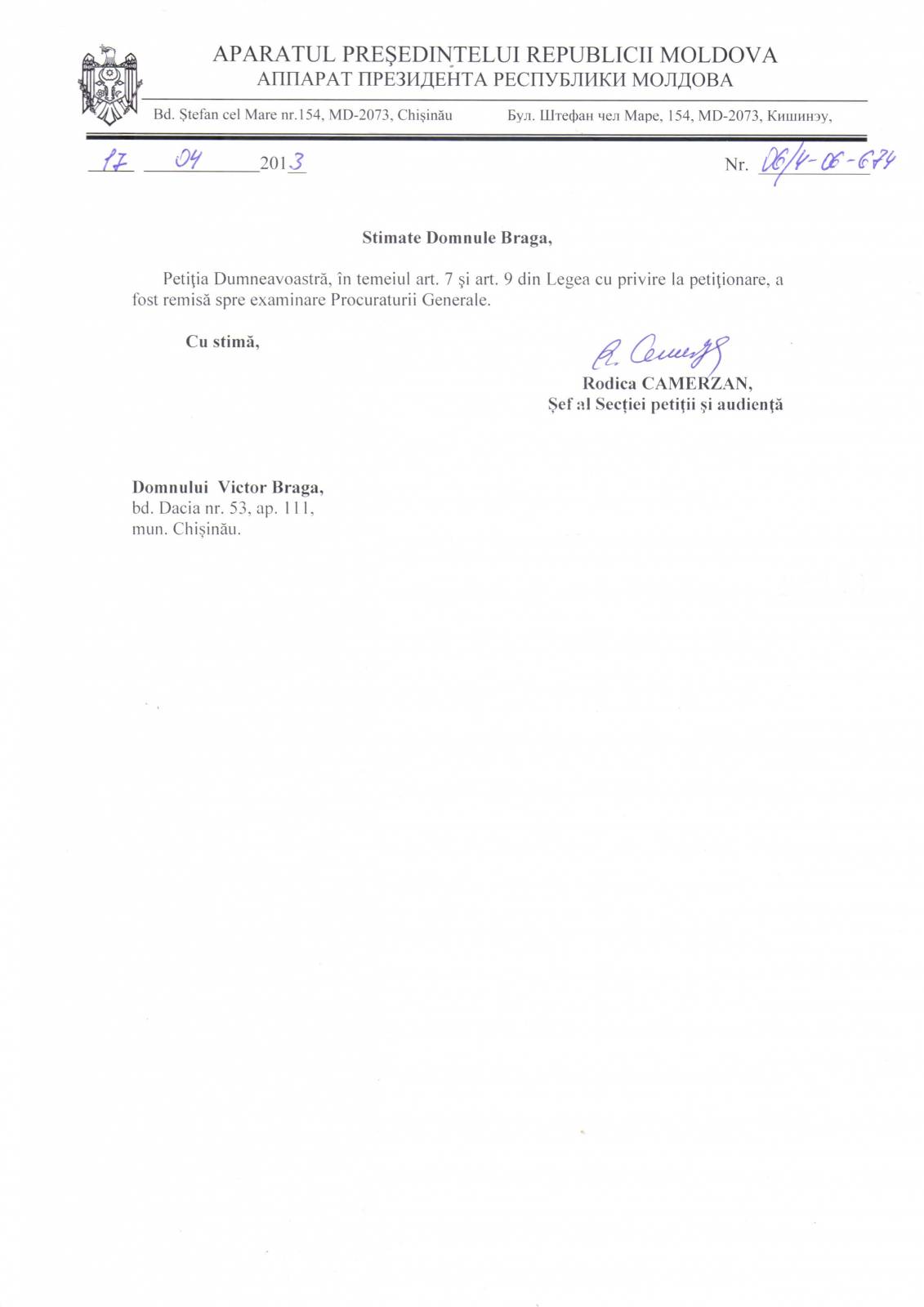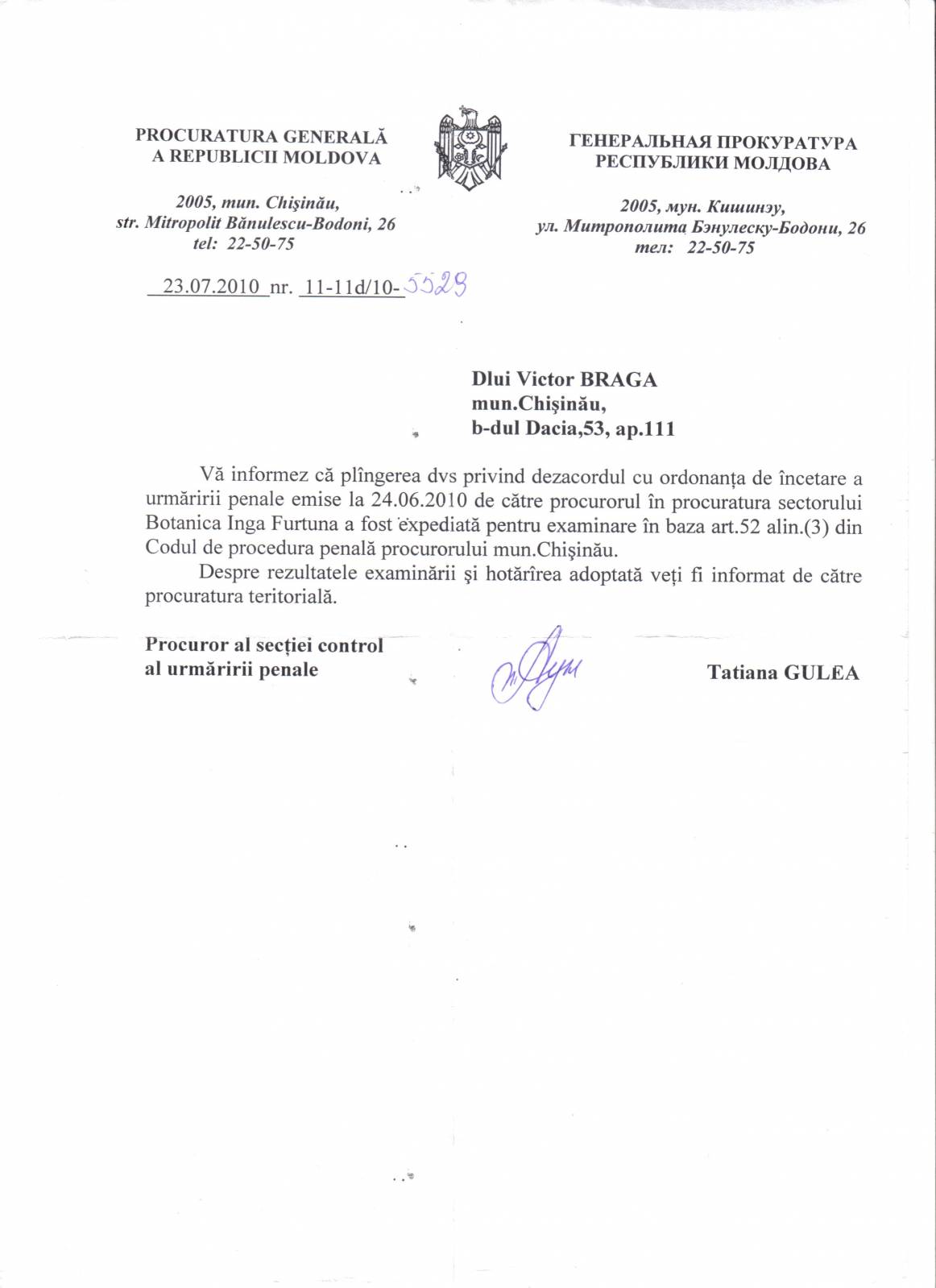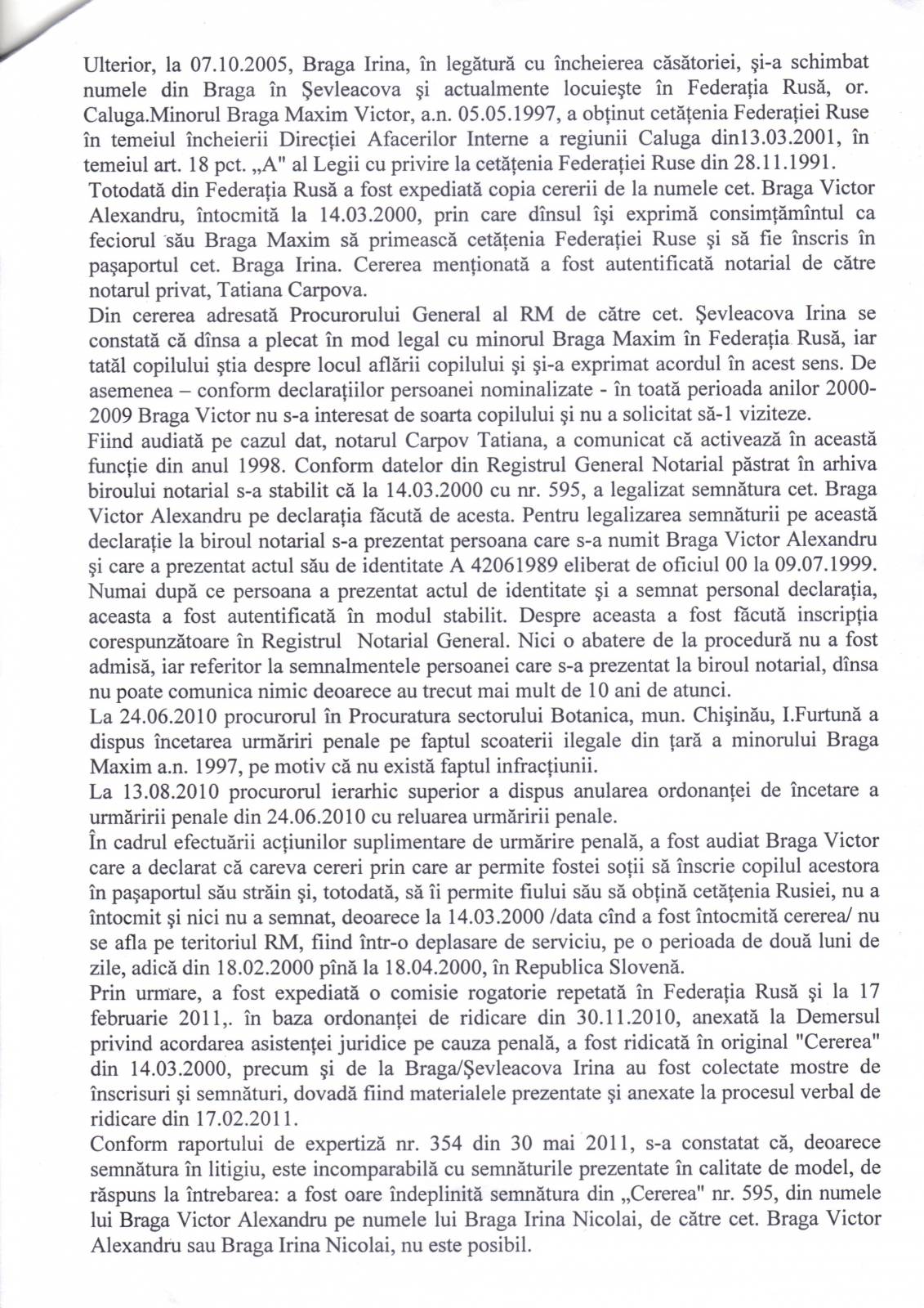 Refuzul Procuraturii de a porni un Dosar Penal împotriva acţiunilor ilegale ale notarului T Carpov [164]